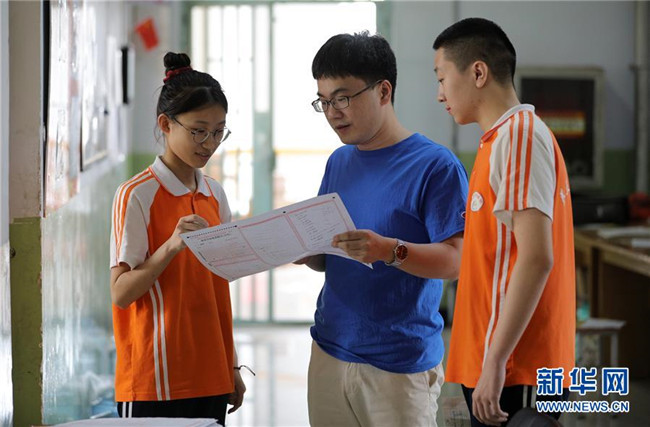 6月18日,河北省衡水市第十四中學(xué)高三年級(jí)數(shù)學(xué)老師(中)為學(xué)生講解試題。