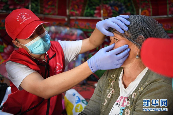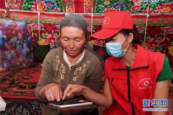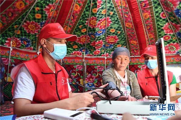 6月20日,新疆阿勒泰地區(qū)布爾津縣也格孜托別鄉(xiāng)克孜勒托蓋村村醫(yī)在布爾津縣黑流灘草原給牧民巴合提古麗·塔拉甫汗檢查身體。圍繞實(shí)現(xiàn)人人享有基本醫(yī)療衛(wèi)生服務(wù)目標(biāo),2016年起,新疆布爾津縣開(kāi)展家庭醫(yī)生簽約服務(wù)工作。該縣組建家庭醫(yī)生簽約團(tuán)隊(duì)65個(gè),團(tuán)隊(duì)醫(yī)務(wù)人員233名,通過(guò)手機(jī)APP、基本公衛(wèi)系統(tǒng)與全縣建檔立卡貧困戶進(jìn)行電子化簽約,提升村醫(yī)隨訪的工作效率和質(zhì)量。截至目前,已完成簽約42936人,履約40043人。新華社記者沙達(dá)提攝