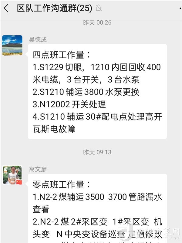 “南翼1210回風巷回收400米低壓電纜”“南翼1210輔運3800米處更換水泵一臺”......凌晨十二點半,剛下晚班的跟班副區(qū)長吳德成便用手機編輯信息,將當班任務完成情況匯報至區(qū)隊工作微信群。