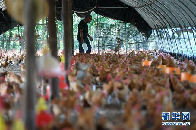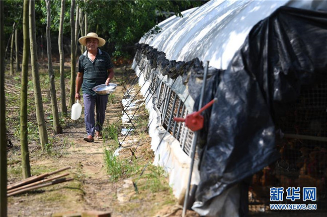 6月26日,在肥西縣花崗鎮(zhèn)楊灣村的土雞養(yǎng)殖基地里,黃榮春在雞棚里忙碌。新華社記者 劉軍喜 攝