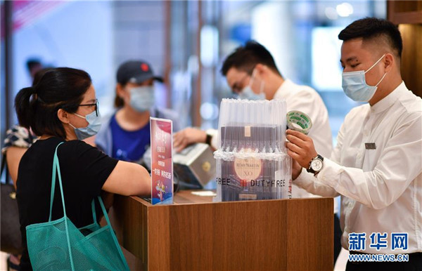7月1日,??谌赵聫V場免稅店的工作人員為顧客打包酒類商品。當日,海南開始實施調(diào)整后的離島免稅購物政策。海南離島旅客每年每人免稅購物額度提高至10萬元,電子消費產(chǎn)品等7類新增商品開售。新華社記者郭程攝