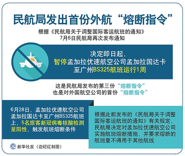 根據(jù)此前發(fā)布的《民航局關于調(diào)整國際客運航班的通知》有關規(guī)定,民航局決定對孟加拉優(yōu)速航空公司實施航班熔斷措施,并要求熔斷的航班量不得用于其他航線。(記者齊中熙)