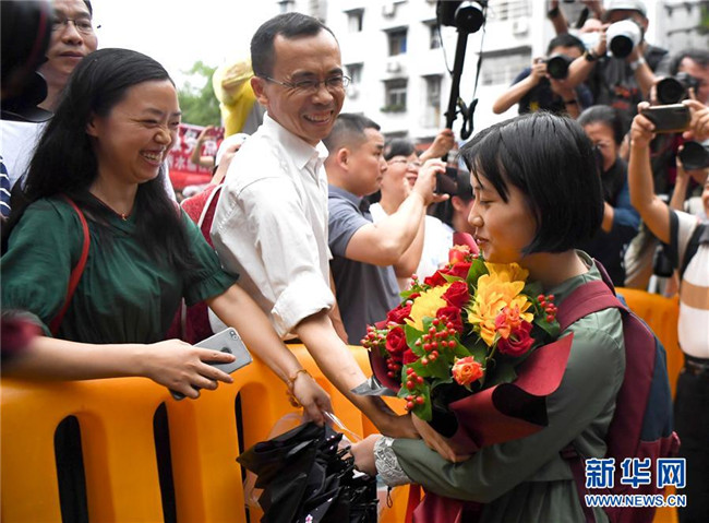 7月8日,一名考生(右)在湖南省長沙市一中考點外從家長手中接過鮮花。 當日,全國部分地區(qū)2020年高考結(jié)束。 新華社記者 薛宇舸 攝