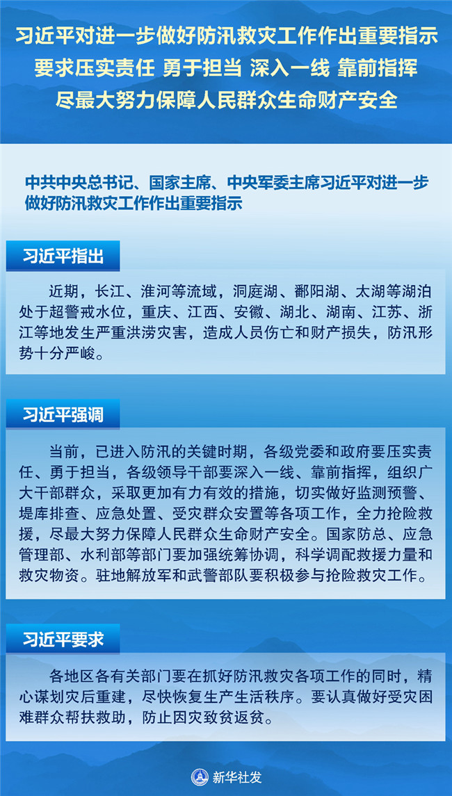 中共中央總書記、國家主席、中央軍委主席習近平對進一步做好防汛救災(zāi)工作作出重要指示。