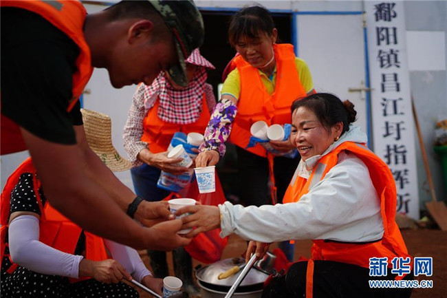 7月11日,在江西省鄱陽縣鄱陽鎮(zhèn)江家?guī)X村,“阿姨團(tuán)”隊(duì)長余風(fēng)英(右一)給武警戰(zhàn)士盛綠豆湯。 新華社記者 周密 攝