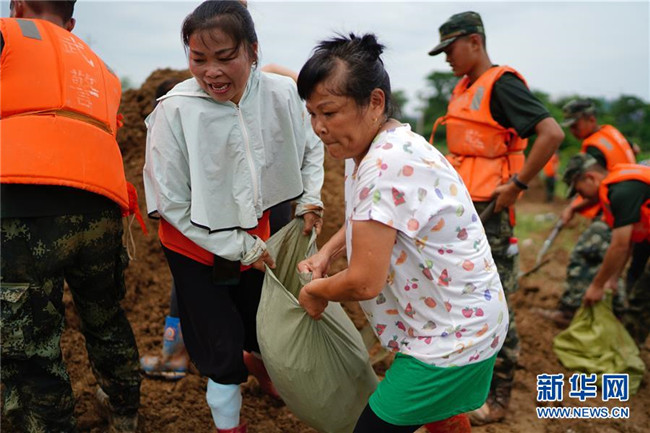 村民余風(fēng)英是這支“阿姨團(tuán)”的隊(duì)長,“我們之前都是一起跳廣場(chǎng)舞的‘舞友’,洪水來了,看到這么多救援人員來幫我們修圩堤,我們也要盡一份自己的力量。”
