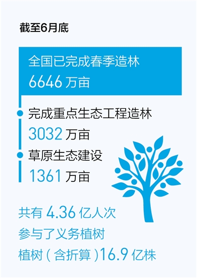 記者從國家林業(yè)和草原局獲悉:今年上半年,全國綠化委員會、國家林業(yè)和草原局科學指導各地各部門在做好疫情防控的同時積極有序開展春季造林綠化。截至6月底,全國已完成春季造林6646萬畝,占全年造林任務的65.8%;完成重點生態(tài)工程造林3032萬畝、草原生態(tài)建設1361萬畝。共有4.36億人次參與了義務植樹,植樹(含折算)16.9億株。