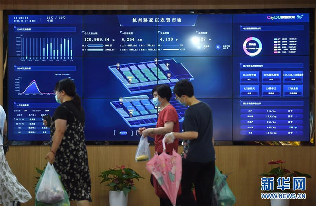浙江省杭州市的5G農(nóng)貿(mào)市場——駱家莊農(nóng)貿(mào)市場的大屏幕上實(shí)時(shí)顯示交易、客流等相關(guān)情況(5月17日攝)。新華社記者 韓傳號(hào) 攝