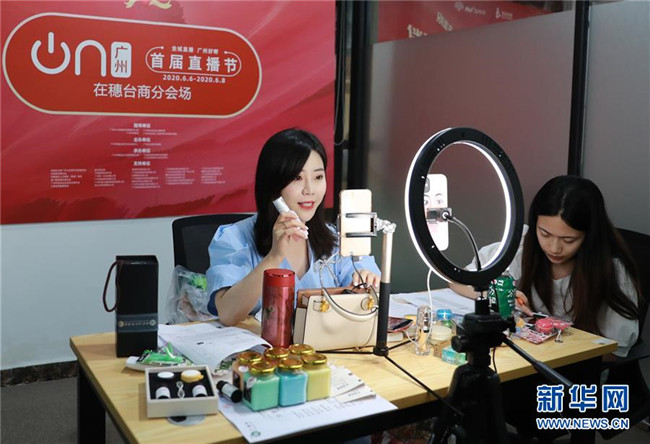 6月6日,廣州啟動(dòng)“首屆直播節(jié)”活動(dòng),這是主播在廣州市白云區(qū)臺(tái)商分會(huì)場直播帶貨。新華社記者 盧燁 攝