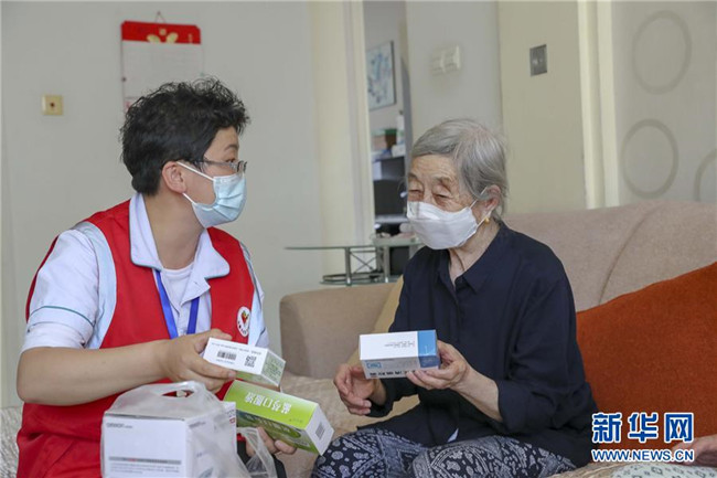 烏魯木齊市沙依巴克區(qū)騰威社區(qū)的志愿者為獨居老人送來蔬菜和常用藥品(7月18日攝)。 新華社發(fā)(陳宇 攝)