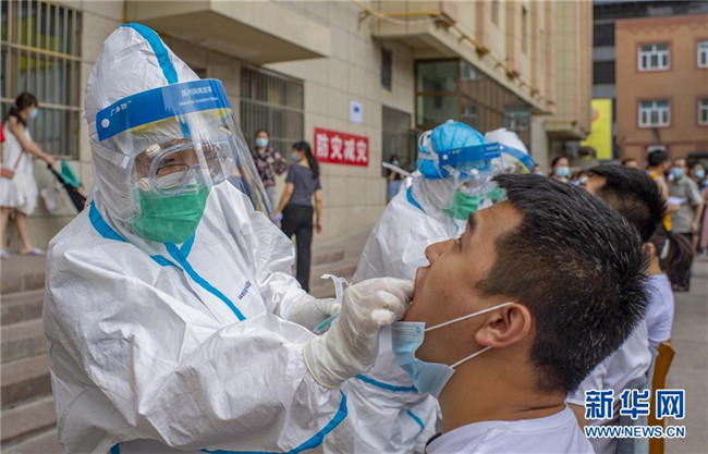 7月17日起,烏魯木齊市開始對全市居民進行免費核酸檢測,重點人群所在社區(qū)要實現(xiàn)100%檢測。家住天山區(qū)光北社區(qū)的63歲居民雷雙蘭說:“19日社區(qū)挨戶通知下樓排隊檢測,大家都戴著口罩,前后保持一米安全距離,一家人幾分鐘就檢測完了。”