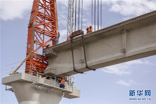 19日上午,位于新疆若羌縣依吞布拉克鎮(zhèn)的G315國道一號大橋上,隨著一根重達16噸的T梁穩(wěn)穩(wěn)落在橋墩上,新疆在建重大工程格(爾木)庫(爾勒)鐵路新疆段最后一座跨315國道的橋梁架設(shè)完工。