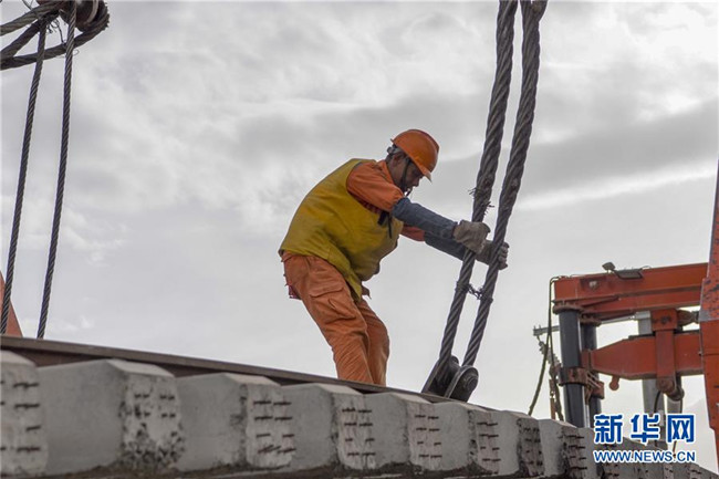 中鐵一局施工人員在格庫鐵路(青海格爾木至新疆庫爾勒)新疆段建設(shè)現(xiàn)場作業(yè)(7月18日攝)。 新華社記者 丁磊 攝