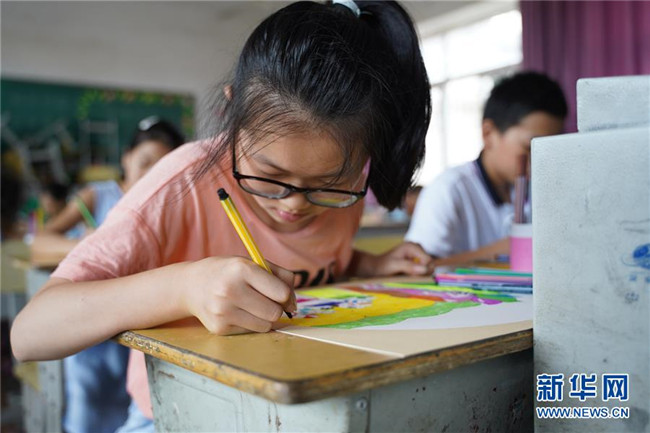 7月23日,在廬山市蛟塘鎮(zhèn)中心小學(xué)安置點,小朋友在美術(shù)課上繪畫。新華社記者 張浩波 攝