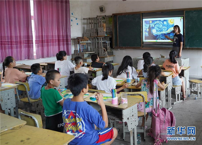 7月23日,在廬山市蛟塘鎮(zhèn)中心小學(xué)安置點,老師給孩子們講解美術(shù)作品。新華社記者 張浩波 攝