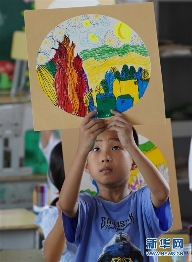 7月23日,在廬山市蛟塘鎮(zhèn)中心小學(xué)安置點,一名小朋友展示自己的繪畫作品。新華社記者 張浩波 攝