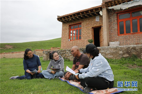 7月23日,在甘肅省甘南藏族自治州夏河縣桑科鎮(zhèn)崗岔村,卓瑪吉(左二)和駐村幫扶工作隊(duì)隊(duì)員一起入戶了解村民巴桑一家的生產(chǎn)生活情況。崗岔村是甘肅省甘南藏族自治州夏河縣??奇?zhèn)的一個牧業(yè)村,平均海拔3000米以上。2018年,在夏河縣文明辦工作的卓瑪吉開始擔(dān)任駐村幫扶工作隊(duì)隊(duì)長,每年都有200多天待在草原上。兩年來,卓瑪吉帶領(lǐng)大家開辦扶貧車間,發(fā)展特色產(chǎn)業(yè),聯(lián)系勞務(wù)輸出。為了讓村民更全面地了解精準(zhǔn)扶貧政策,卓瑪吉登門宣講政策。為了提高村容村貌,卓瑪吉發(fā)動大家開展廁所革命和庭院環(huán)境評比,積極響應(yīng)甘南藏族自治州“全域無垃圾”創(chuàng)建行動。她還從縣城請來醫(yī)生,為村民舉辦健康講座,在全村婦女中開展“兩癌篩查”。如今,崗岔村變成了干凈、整齊、富裕、美麗的生態(tài)文明村,提前實(shí)現(xiàn)了整村脫貧。談起心愿,卓瑪吉說:“要讓草原和草原上的人都變得更美。”新華社發(fā)(杜哲宇攝)