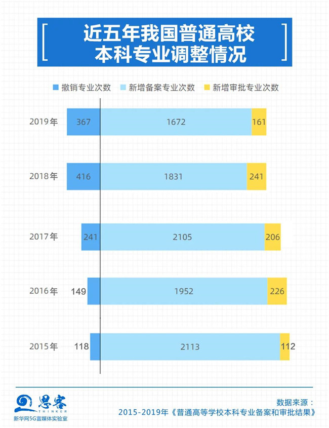 4近五年我國普通高校本科專業(yè)調(diào)整情況 近年來,隨著經(jīng)濟社會的不斷發(fā)展,高校的專業(yè)設(shè)置也在不斷更迭,可供選擇的專業(yè)也越來越多。2015年開始,全國高校每年增設(shè)專業(yè)數(shù)量在2000個左右,撤銷專業(yè)的數(shù)量也超過100個。