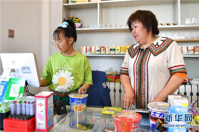 索云(右)在位于敖魯古雅鄂溫克族鄉(xiāng)的自家超市內,指導女兒為顧客結賬(7月14日攝)。 新華社記者 貝赫 攝