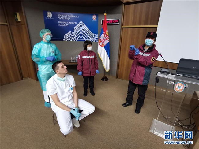 3月28日,中國(guó)赴塞爾維亞抗疫醫(yī)療專家組在貝爾格萊德對(duì)醫(yī)護(hù)人員進(jìn)行培訓(xùn)時(shí)講解標(biāo)本采集。 新華社發(fā)(專家組供圖)