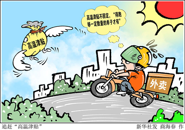 采訪中,有的勞動者反映,往年可以拿到高溫津貼,今年要么沒動靜,要么到手的大幅“縮水”。某平臺外賣騎手小李告訴記者,去年還有高溫津貼可拿,今年到目前什么都沒有。另一名騎手小朱說,高溫津貼不固定,“得跑夠一定數量的單子才有”。還有其他平臺的一些騎手表示沒聽說過有津貼。