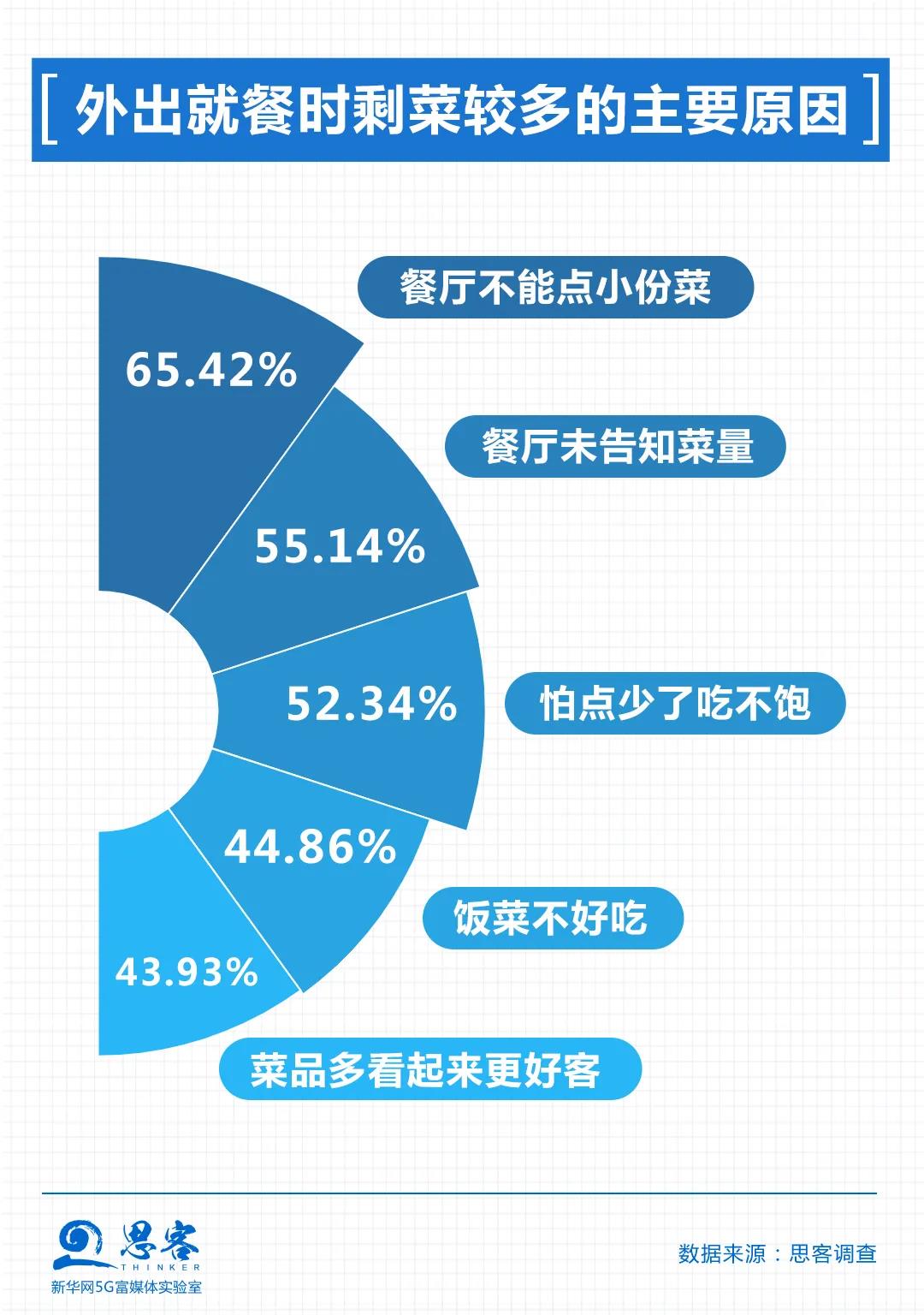 餐廳不能點小份菜、餐廳未明確標明菜量、怕點少了吃不飽是受訪者認為剩菜較多的主要原因,分別占65.42%、55.14%和52.34%。