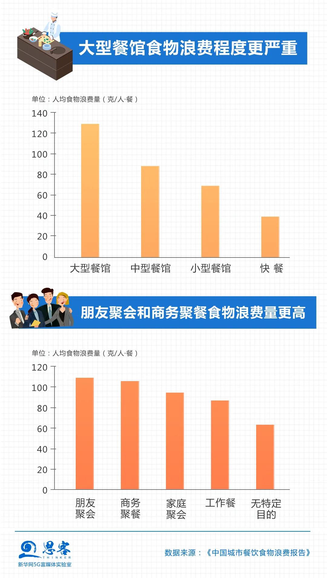 大型餐館等是餐飲食物浪費的“重災區(qū)”。調(diào)研顯示,大型餐館的人均浪費量最高,為每餐每人132克,是快餐人均浪費量(每餐每人38克)的近3.5倍。