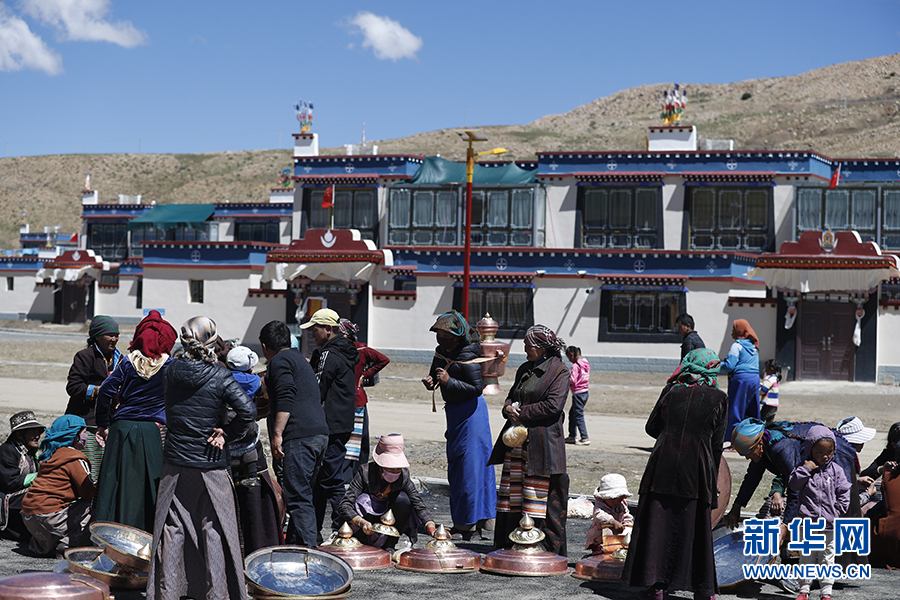 白瑪?shù)膵寢尪松纤钟筒?,一邊喝著酥油茶,一邊和我聊起新房的事情。白瑪?shù)膵寢屨f,以前住在山頂上,房屋密集、布局混亂,排水系統(tǒng)落后。新村建成后,她們就搬了下來,村里配套設(shè)施齊全,房子住起來也舒適。