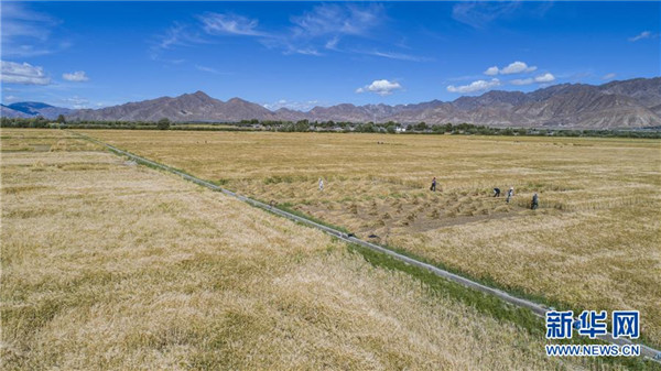8月29日,農民在日喀則市江孜縣的青稞田里忙收割(無人機照片)。日喀則是西藏重要的商品糧基地,被譽為“西藏糧倉”。當前正值青稞收獲季節(jié),當地農民抓緊收割,農田里一片繁忙景象。新華社記者孫非攝