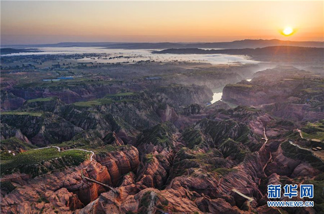 一輪紅日照耀著靖邊縣龍洲鎮(zhèn)波浪谷丹霞景區(qū)(9月24日攝,無人機照片)。新華社記者 陶明 攝