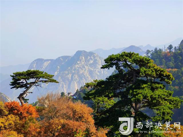 秋天的華山很是動(dòng)人。天高云淡,漫山紅葉分外妖嬈,彩林賞心悅目,一步一景,滿目所見(jiàn)皆是驚喜。若是乘索道而上,層林金黃與郁郁蔥蔥的華山松、灰白的花崗巖山體相互迎映襯,形成了秋天多彩的西岳風(fēng)光。