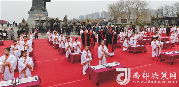 西安百余名學(xué)童在西安漢城湖舉行漢服開筆禮