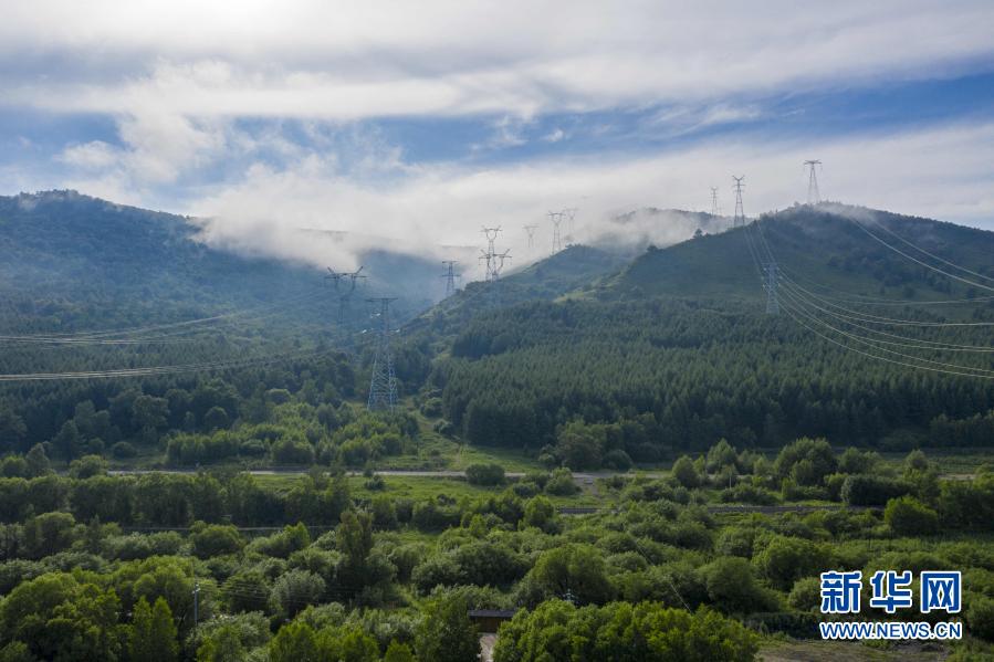 內蒙古阿爾山市五岔溝鎮(zhèn)大山深處,輸電塔高聳山間(7月4日攝)?!⌒氯A社發(fā)(畢力格 攝)