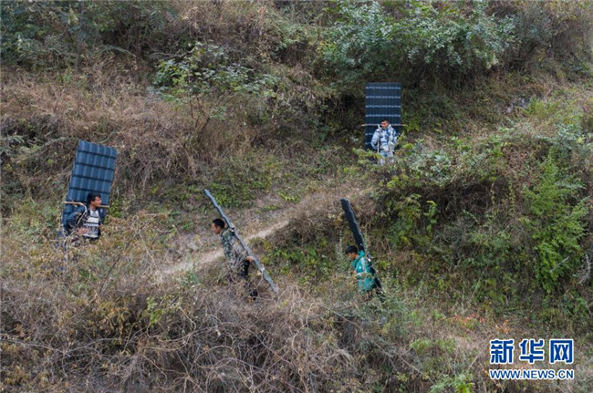 12月23日,某色蘇不惹(右一)和同伴背著修民宿的建材往村里走(無(wú)人機(jī)照片)。新華社記者 江宏景 攝