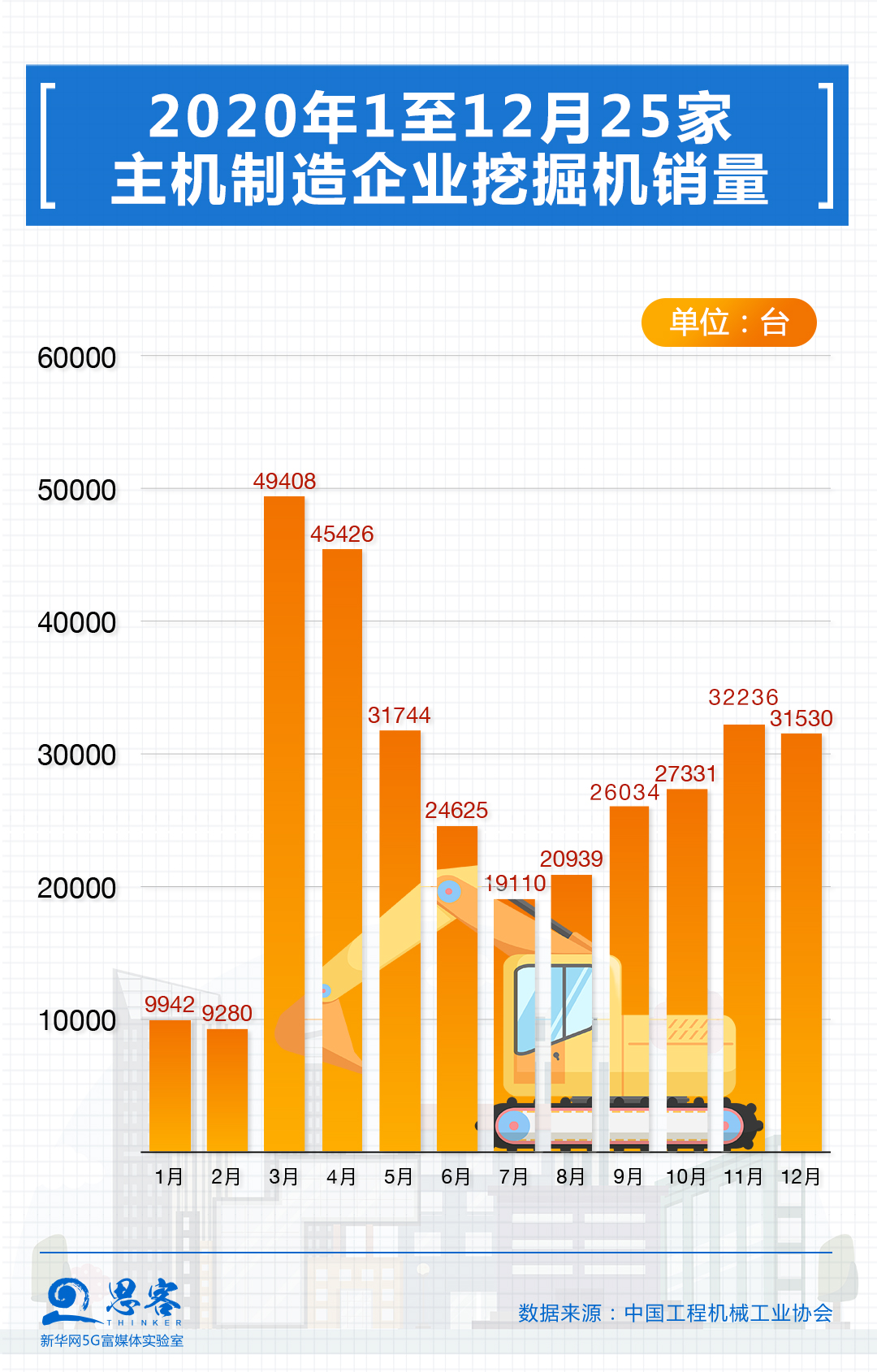 挖掘機(jī)銷量素有中國經(jīng)濟(jì)“溫度計(jì)”之稱。據(jù)中國工程機(jī)械工業(yè)協(xié)會(huì)統(tǒng)計(jì),2020年12月納入統(tǒng)計(jì)的25家挖掘機(jī)制造企業(yè)共銷售各類挖掘機(jī)31530臺(tái),同比增長56.4%;全年共銷售挖掘機(jī)327605臺(tái),同比增長39%。從百萬億里程碑和挖掘機(jī)銷量增長的背后,我們看到了怎樣的中國經(jīng)濟(jì)活力與圖景?