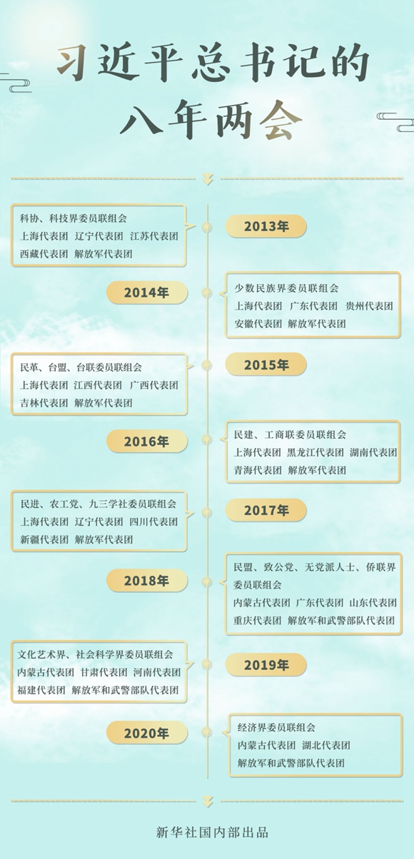 2013-2020,八年的全國兩會(huì)上,總書記46次到團(tuán)組參加審議討論。交流之中,語重心長(zhǎng);言談之間,發(fā)人深思。