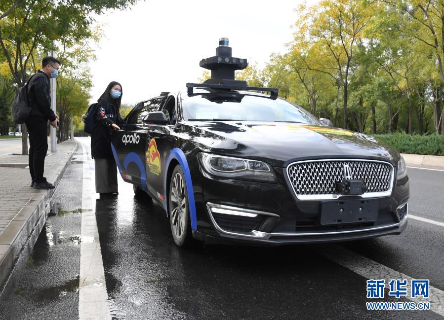 市民在北京市海淀區(qū)稻香湖路的百度自動駕駛出租車指定上車點(diǎn)乘車(2020年10月14日攝)。新華社記者 任超 攝