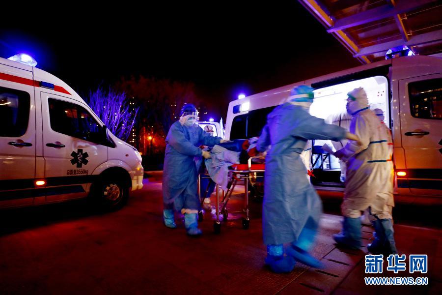 在武漢泰康同濟(jì)醫(yī)院接診大廳外,軍隊(duì)支援湖北醫(yī)療隊(duì)隊(duì)員接收轉(zhuǎn)運(yùn)來(lái)的患者(2020年3月14日攝)。新華社發(fā)(王皓宇 攝)