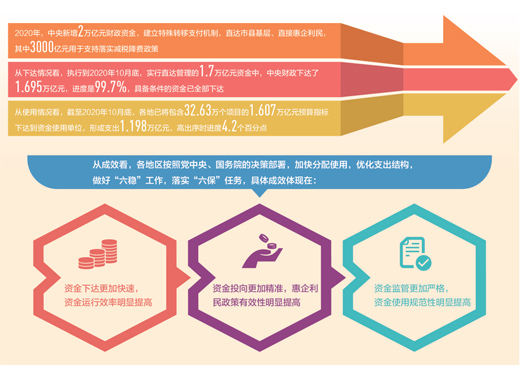今年3月初,財政部調研小組發(fā)布的《2020年中國財政政策執(zhí)行情況報告》顯示,直達資金執(zhí)行情況總體良好,“僅用20天時間,就將95%的中央直達資金下達市縣基層,省級財政細化下達時間平均只有1周,速度前所未有。”“目前,財政直達資金預算下達已經完成,其中1.56萬億元資金已經投入使用,預算執(zhí)行情況總體良好,重點領域支出保障有力,效果明顯。”