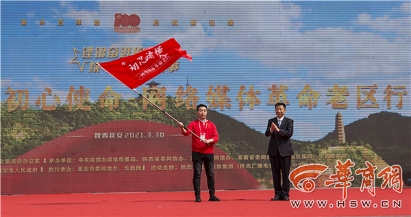 主會場活動結(jié)束后,陜西分會場“在這里讀懂初心使命——網(wǎng)絡媒體革命老區(qū)行”網(wǎng)絡主題采訪活動在延安寶塔山游客廣場正式啟動。趙剛在分會場啟動儀式上講話并向采訪團授旗。陜西省委網(wǎng)信辦主任鮑永能主持啟動儀式。中央網(wǎng)信辦網(wǎng)絡傳播局副局長邵波濤,陜西省委網(wǎng)信辦副主任王利參加啟動儀式。延安市委副書記、政法委書記嚴漢平在啟動儀式上致辭。媒體團代表中國新聞網(wǎng)負責人吳慶才作表態(tài)發(fā)言。