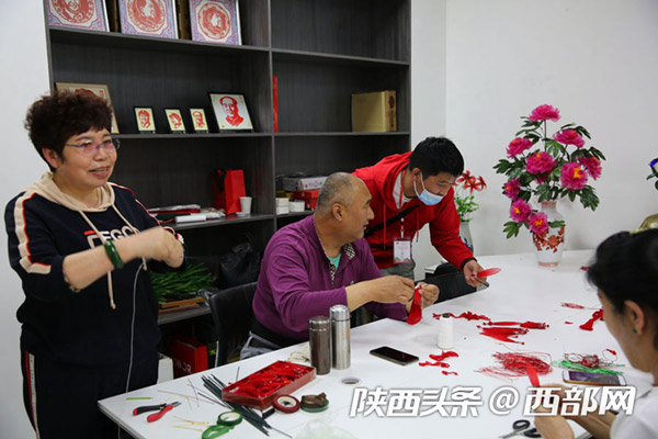 延安市寶塔區(qū)電商直播融合孵化服務(wù)中心,60歲的退休大媽董智玲在教大家做絲網(wǎng)花,她們做著山丹丹花,唱著《山丹丹花開(kāi)紅艷艷》,到這里來(lái)學(xué)手工花的制作成了一件快樂(lè)的事。