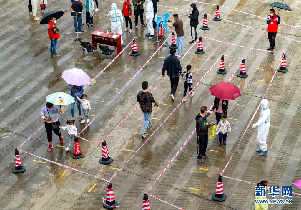 4月6日,在瑞麗市目瑙社區(qū)一核酸檢測點,當?shù)鼐用裢ㄟ^設(shè)置的通道排隊采樣。新華社記者 陳欣波 攝