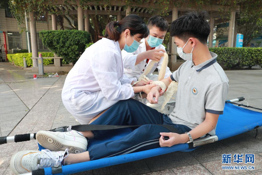 5月11日,在廈門(mén)大學(xué)附屬科技中學(xué)思明校區(qū),學(xué)校醫(yī)務(wù)人員在應(yīng)急救援演練中為一名“傷員”包扎傷口。新華社發(fā)(曾德猛 攝)