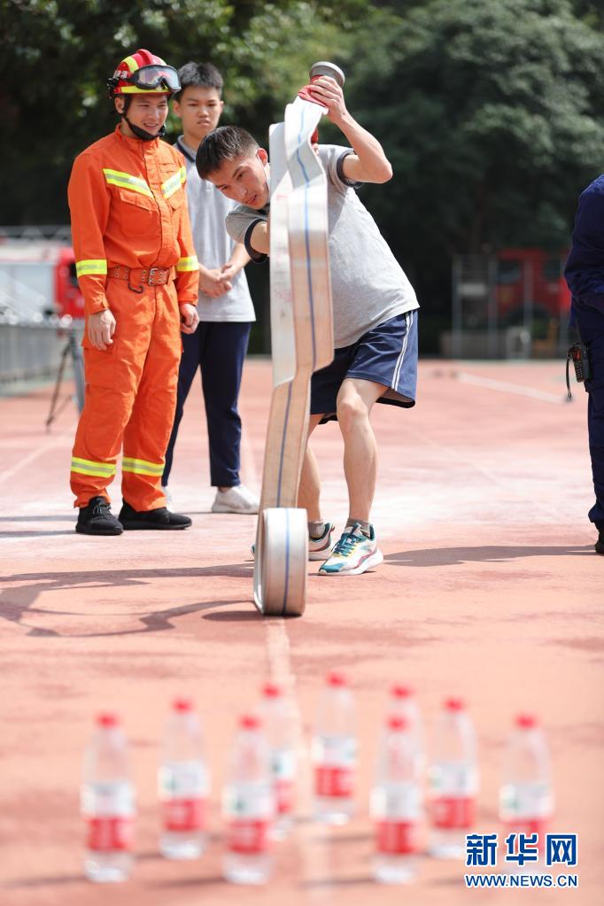5月11日,在廈門(mén)大學(xué)附屬科技中學(xué)思明校區(qū),學(xué)生在消防員的指導(dǎo)下體驗(yàn)甩消防水帶。新華社發(fā)(曾德猛 攝)