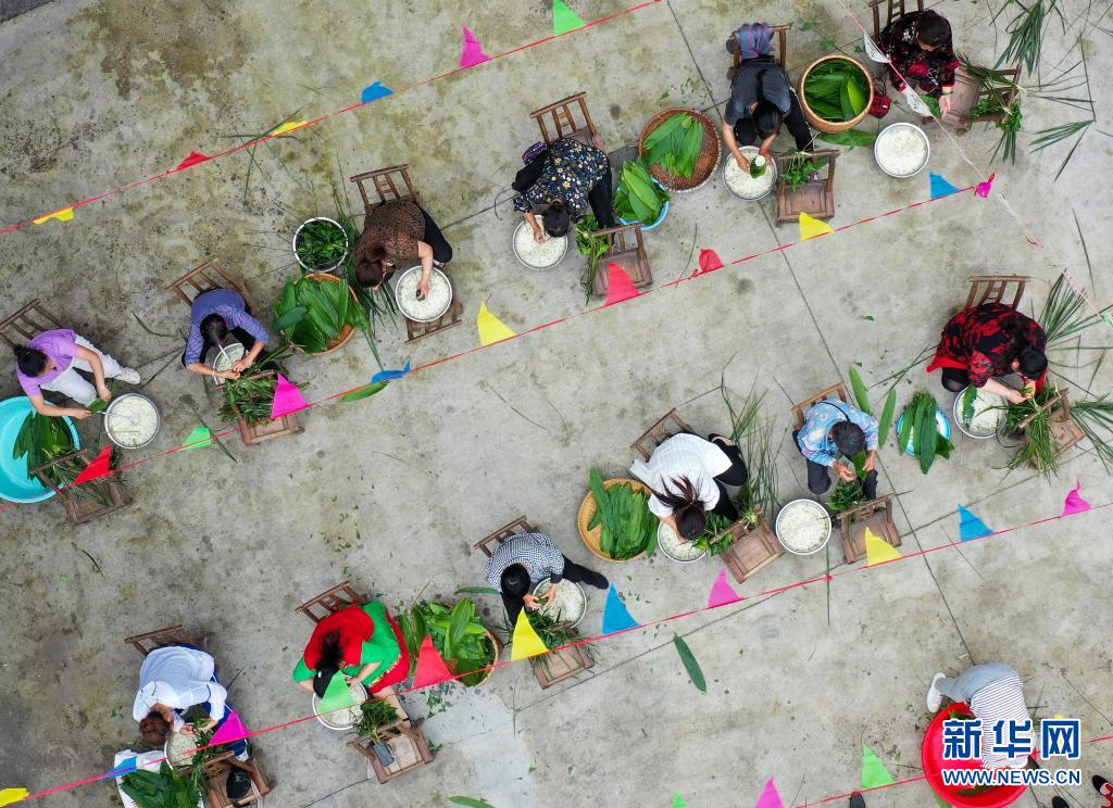 6月2日,貴州省銅仁市玉屏侗族自治縣亞魚鄉(xiāng)郭家灣村村民參加包粽子比賽。新華社發(fā)(李昆攝)