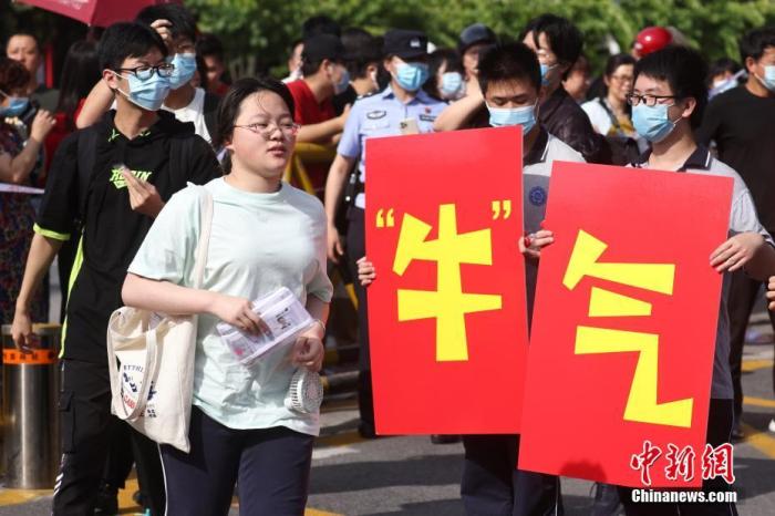 6月7日,江蘇省南京市雨花臺中學(xué)高考考點(diǎn)前,高二的學(xué)生手舉“牛氣沖天”“牛轉(zhuǎn)乾坤”字樣為考生加油鼓勁。 中新社記者 泱波 攝