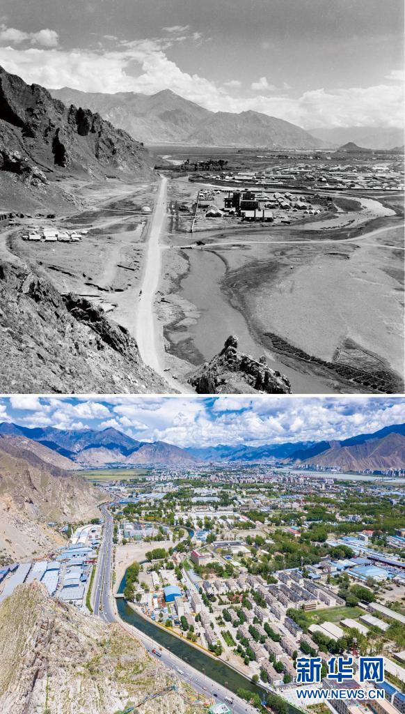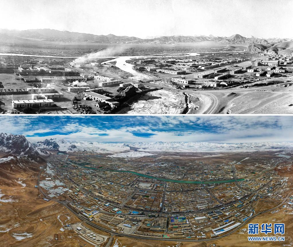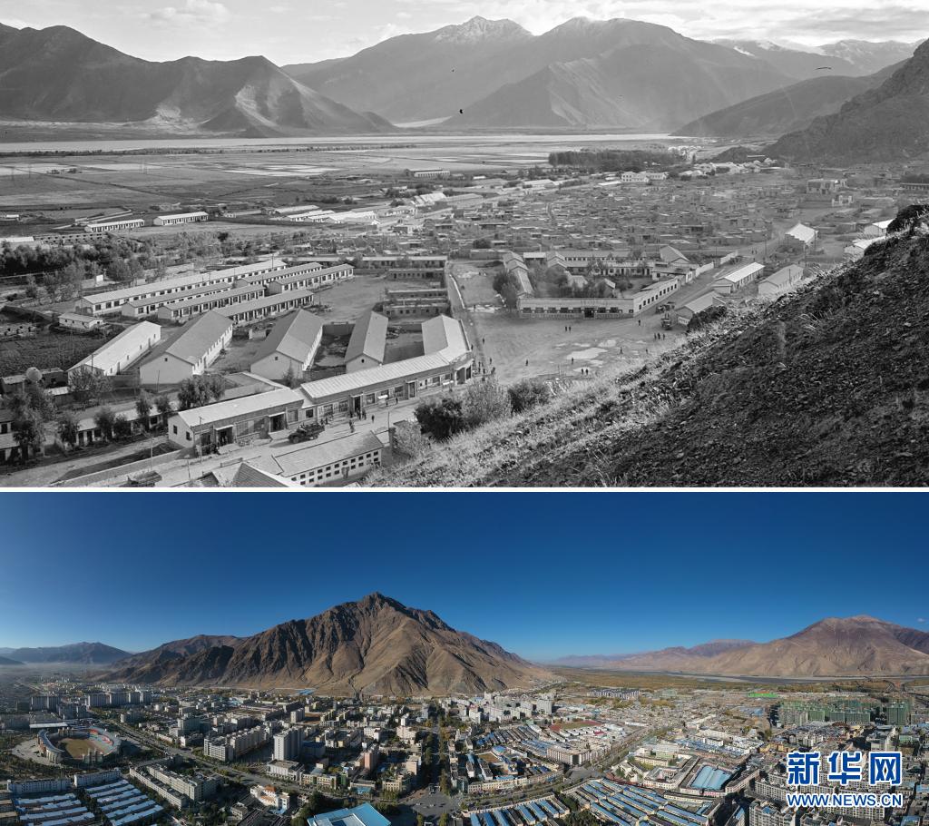 拼版照片:上圖是20世紀(jì)60年代的日喀則(資料照片);下圖是2021年8月9日拍攝的日喀則(新華社記者覺果攝)。新華社發(fā)