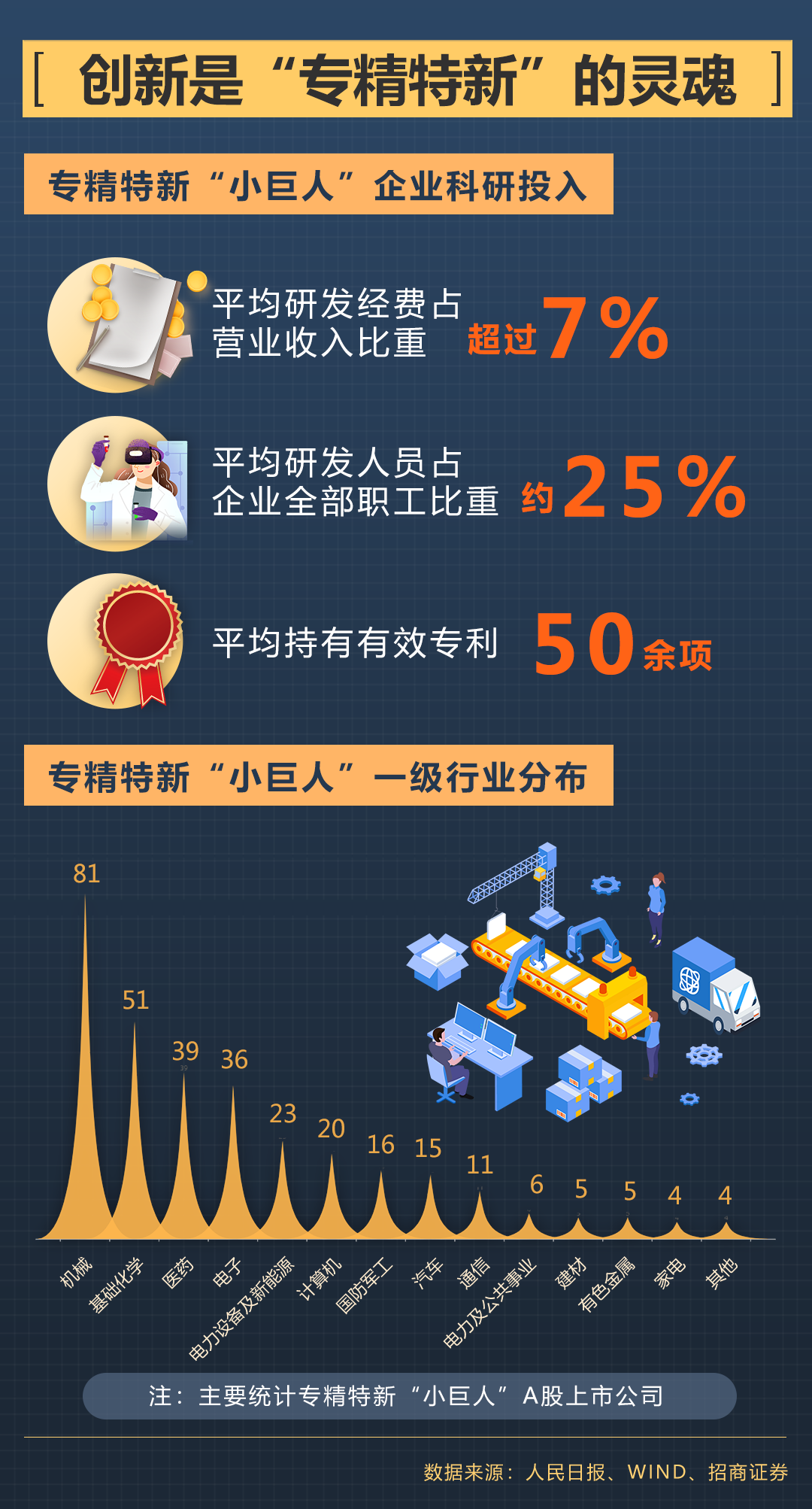 “小巨人”企業(yè)在多個關(guān)鍵領(lǐng)域為龍頭骨干企業(yè)配套,也在細(xì)分領(lǐng)域持續(xù)創(chuàng)新并占據(jù)市場領(lǐng)先地位。這些企業(yè)注重制造業(yè)細(xì)分領(lǐng)域的創(chuàng)新,在上天、入海、探月、高鐵等大國工程中,都能找到“小巨人”企業(yè)的產(chǎn)品。根據(jù)招商證券統(tǒng)計,A股上市的專精特新“小巨人”企業(yè)中,機械行業(yè)的占比最高,基礎(chǔ)化工、醫(yī)藥、電子等緊隨其后。