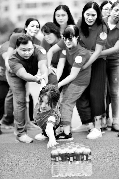 安徽省合肥市琥珀名城小學(xué)教師們參加特色拓展訓(xùn)練,在團(tuán)隊(duì)協(xié)作中凝聚智慧力量。熊偉攝/光明圖片