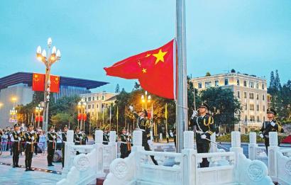 “向國(guó)旗——敬禮!”隨著國(guó)旗護(hù)衛(wèi)隊(duì)領(lǐng)隊(duì)發(fā)出響亮的口令,護(hù)旗隊(duì)員行舉槍禮。